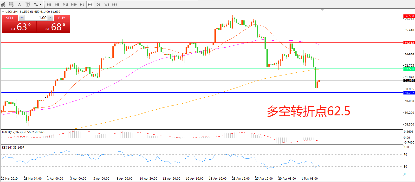 交易策略: 在62.50之下看跌,目标60.00    58.00