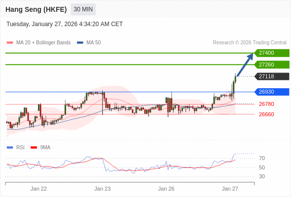 在 26930 之上,看涨,目标价位为 27260 ,然后为 27400 。