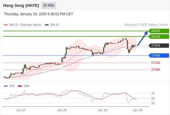 在 27490 之上,看涨,目标价位为 28140 ,然后为 28330 。