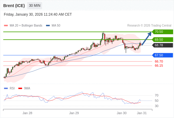在 67.50 之上,看涨,目标价位为 69.50 ,然后为 70.50 。