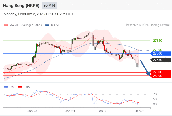 香港恒生指数期货 当日内: 目标位为27000。
