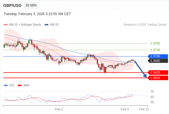 交易策略: 在 1.3700 之下,看跌,目标价位为 1.3625 ,然后为 1.3600 。