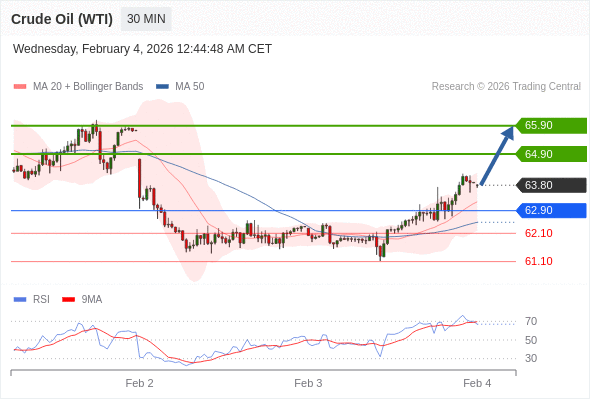 在 62.90 之上,看涨,目标价位为 64.90 ,然后为 65.90 。