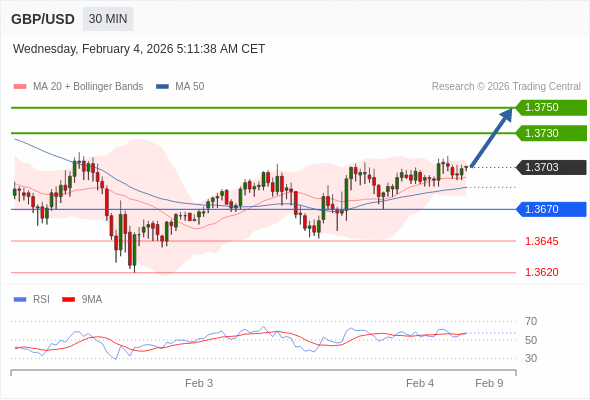 在 1.3670 之上,看涨,目标价位为 1.3720 ,然后为 1.3750 。