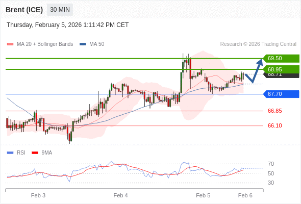 在 67.70 之上,看涨,目标价位为 68.95 ,然后为 69.50 。