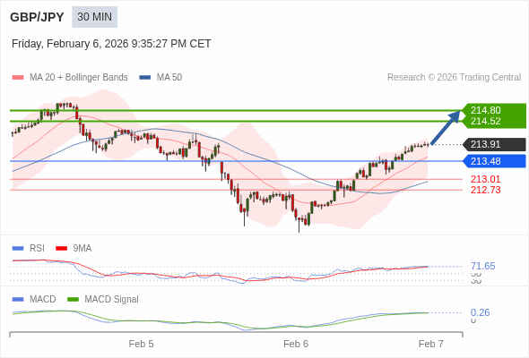 英镑/日元 当日内 : 看涨,当 213.48 为支撑位。