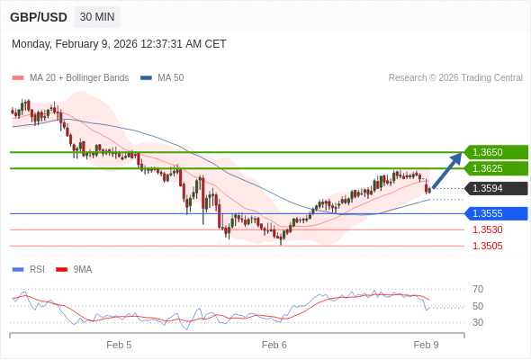 在 1.3555 之上,看涨,目标价位为 1.3625 ,然后为 1.3650 。