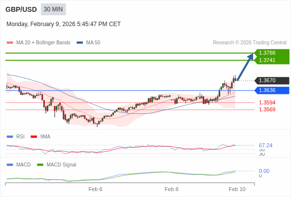 技术点评: RSI技术指标大于中性区域50。 MACD技术指标处在其信号线之上看多。 配置为正。 此外,价位高于其20天及50天移动平均线 ( 分别位于1.3630 和1.3617 )。