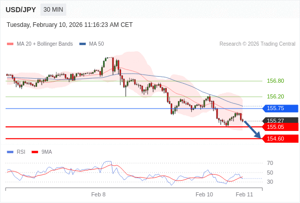 在 155.75 之下,看跌,目标价位为 155.05 ,然后为 154.60 。