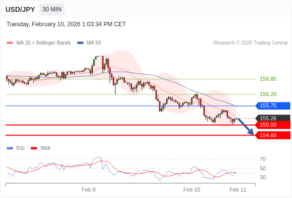在 155.75 之下,看跌,目标价位为 155.00 ,然后为 154.60 。