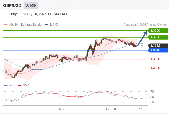 在 1.3640 之上,看涨,目标价位为 1.3700 ,然后为 1.3730 。