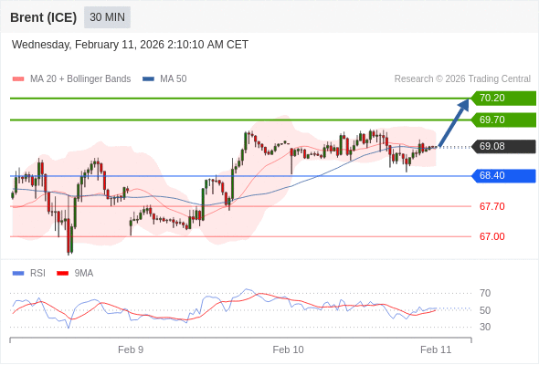 在 68.40 之上,看涨,目标价位为 69.70 ,然后为 70.20 。