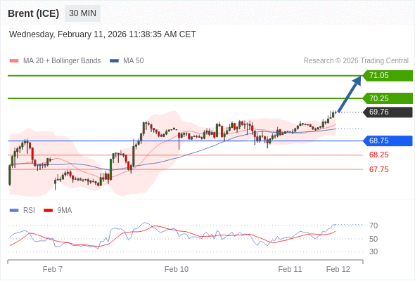 在 68.75 之上,看涨,目标价位为 70.25 ,然后为 71.05 。