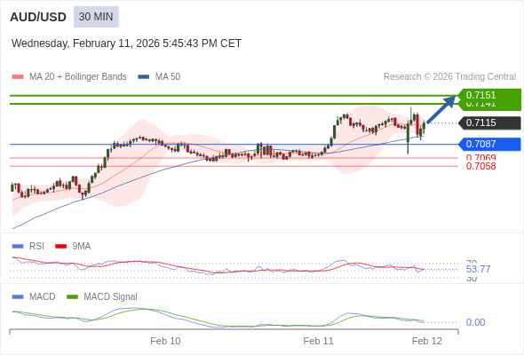 交易策略: 看涨,当 0.7087 为支撑位,目标定在0.7151。