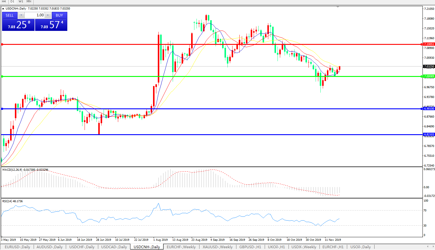 技术面简析:日图均线呈空头排列但短期均线成金叉有走强迹象,汇价站稳7.0关口并持续小幅上攻,MACD运行于0轴下方且量能微收缩,RSI有反弹走升迹象,预计短期汇价将在7.0关口附近维持偏强整理,中期汇价需等待美元指数及中美贸易谈判进展指引。