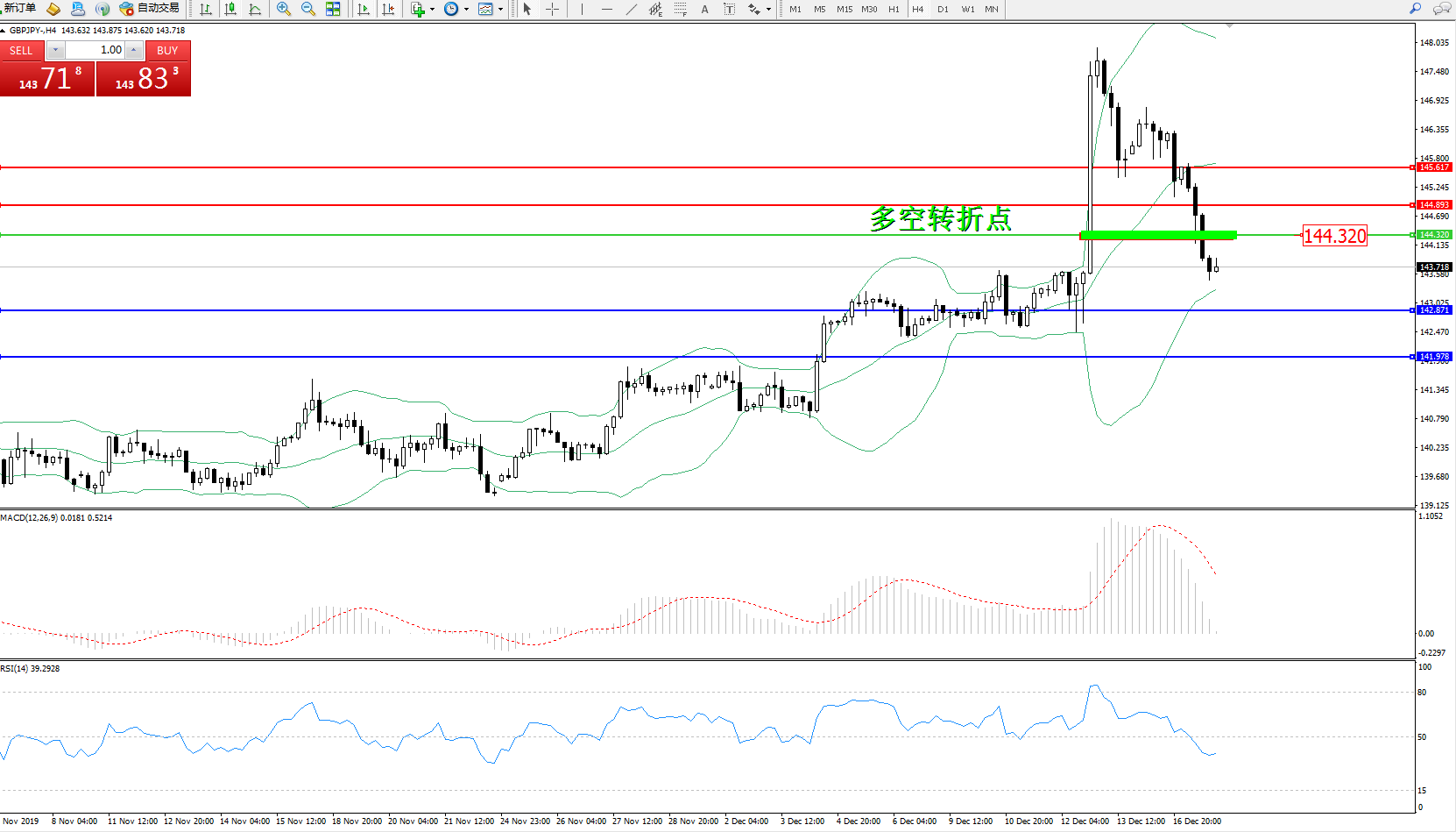 交易策略:144.320下方看跌,目标142.871、141.978
