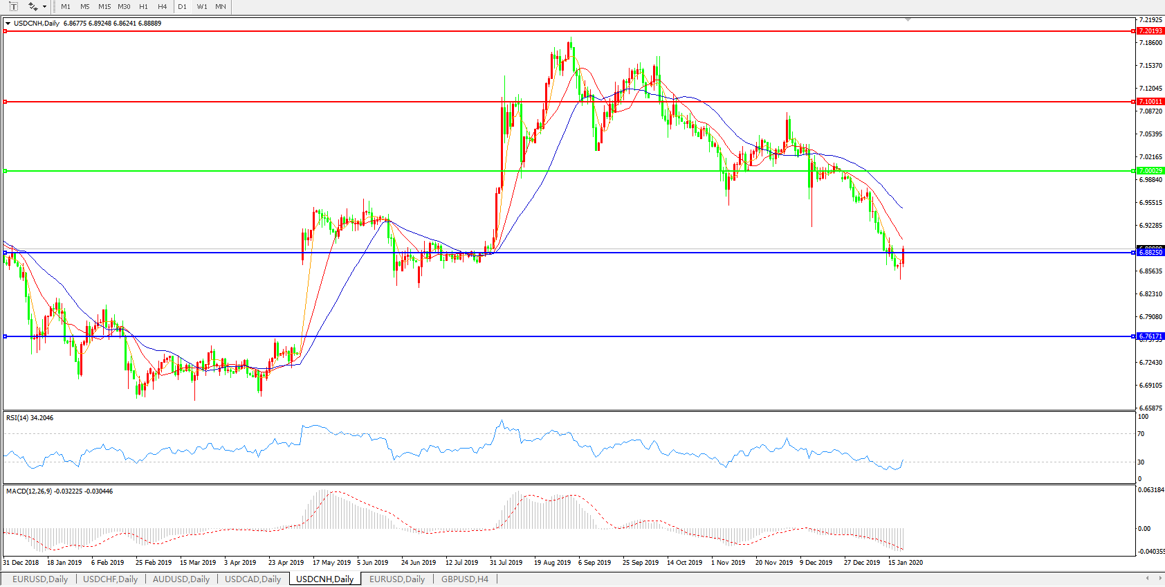 交易策略: 在7.0000之下,看跌,目标价位为6.8820,然后为6.7600。
