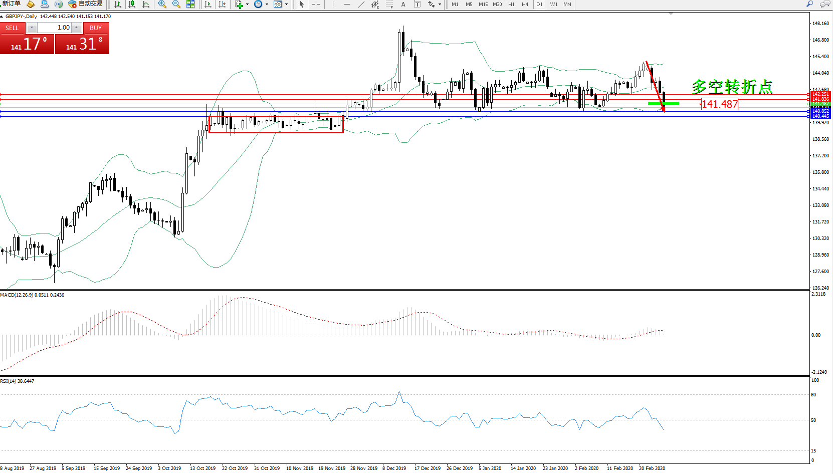 交易策略:141.487下方看跌,目标140.852140.445