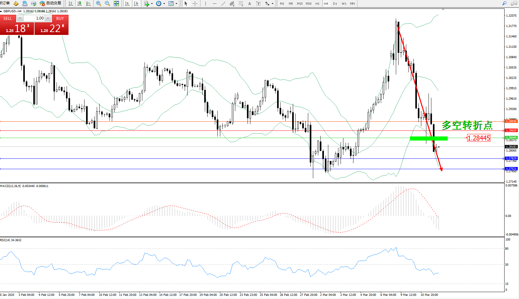 交易策略:1.28445下方看跌,目标1.27829、1.27521