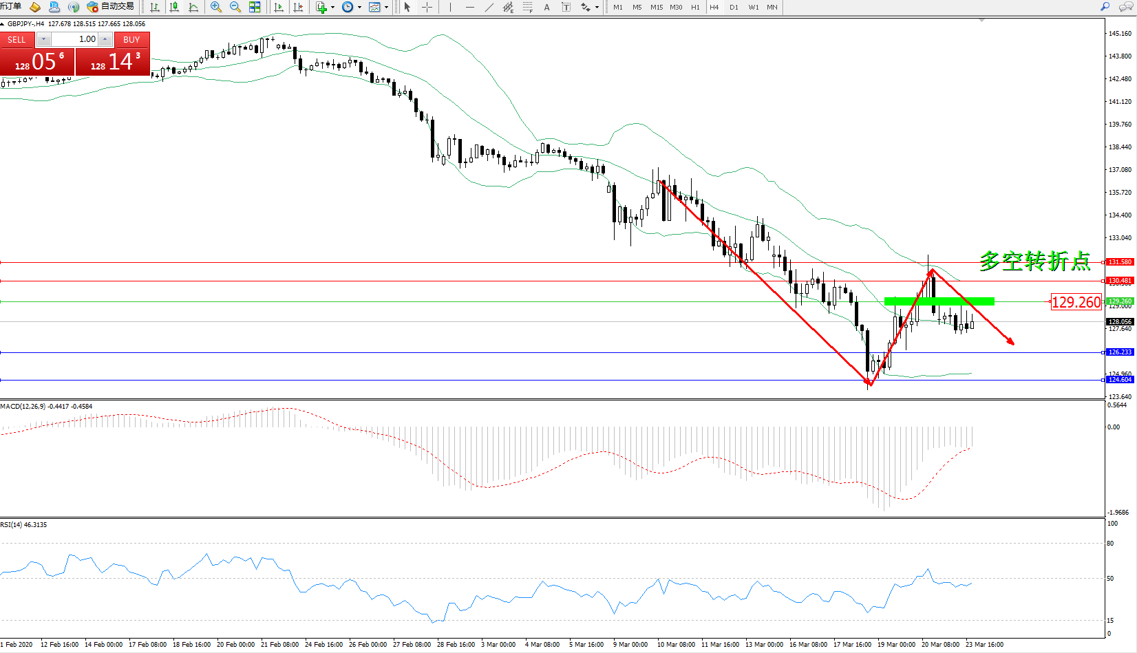 交易策略:129.260下方看跌,目标126.233124.604