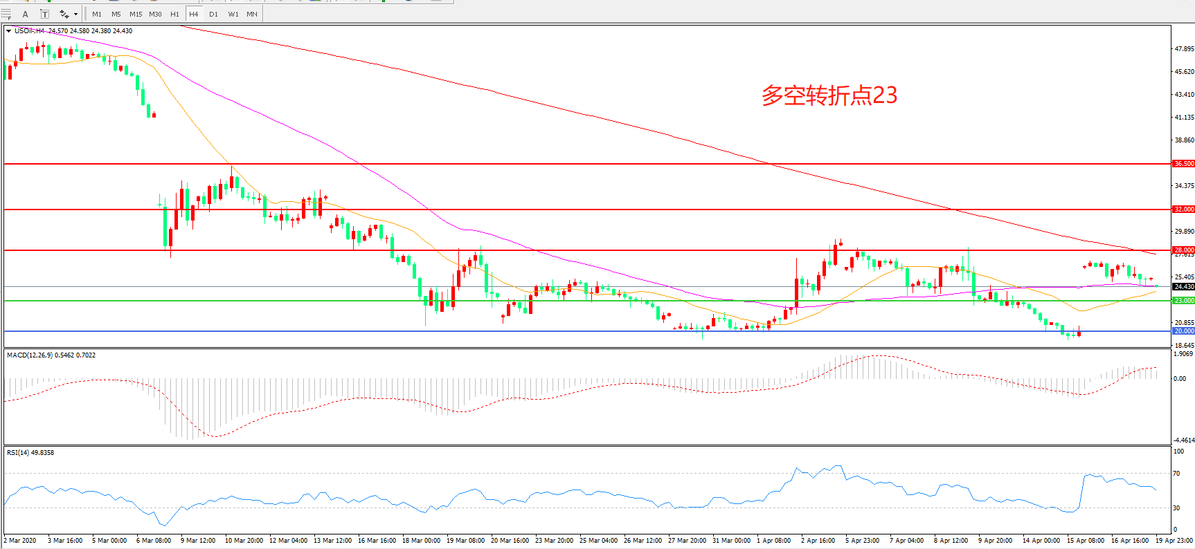 交易策略:在23.00之下看跌,目标20.00 18.00