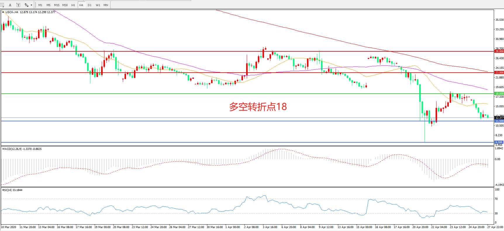 4小时图看,油价震荡下行,整体表现低迷,均线系统仍呈空头排列,11.5美元成为短期支撑, MACD绿柱增加,RSI指标走平,日内延续震荡概率较大。