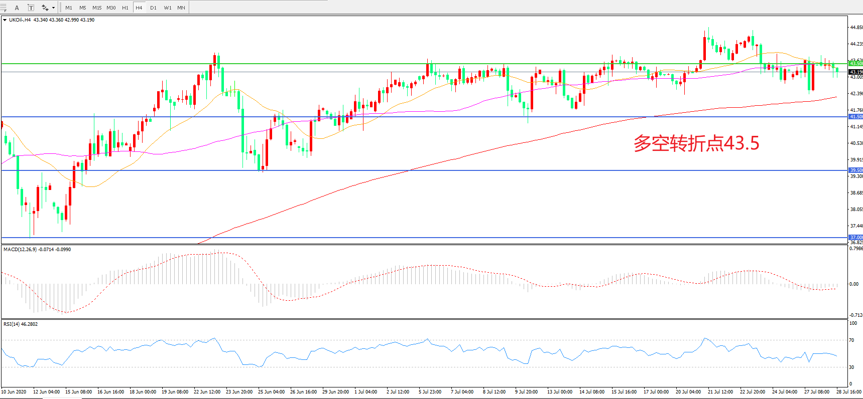 4小时图看,油价延续高位震荡,波幅逐渐收窄,43.5美元成为短期多空分水岭,MACD红柱增加,RSI指标走平,日内延续上行概率较大。