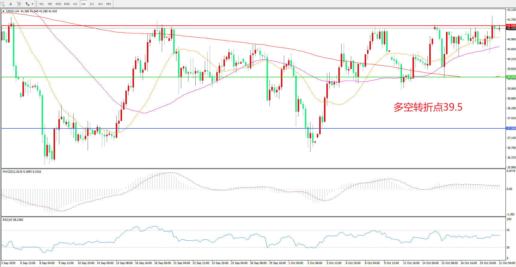 4小时图看,油价以21周期均线为依托震荡上行,整体表现有所回暖,41.5成为短期阻力,MACD红柱增加,RSI指标走平,日内延续上行概率较大。