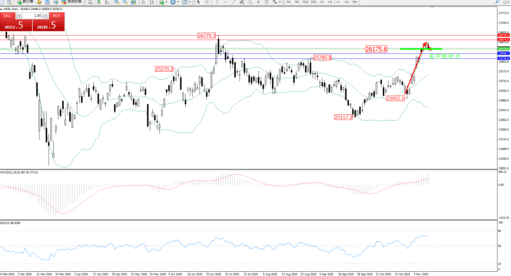 交易策略:26175上方看涨,目标26573、26779
