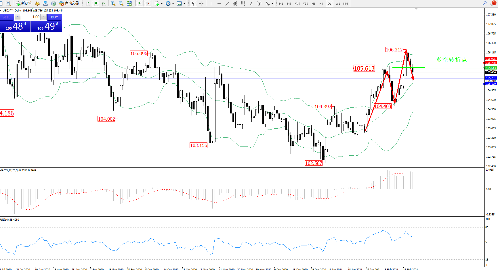 技术点评:多头动力维持在布林带指标通道中上轨区间持续震荡上扬,突破布林带指标上轨附近节点抵达106.212附近后遇阻回撤下行,期间多次来回试探中上轨附近区间节点震荡,布林带指标呈收口走势后持续向上移动中,MACD指标处于多头区域高位整理平移中,RSI指标处于50均衡线上方持续震荡向上移动后反转下移;