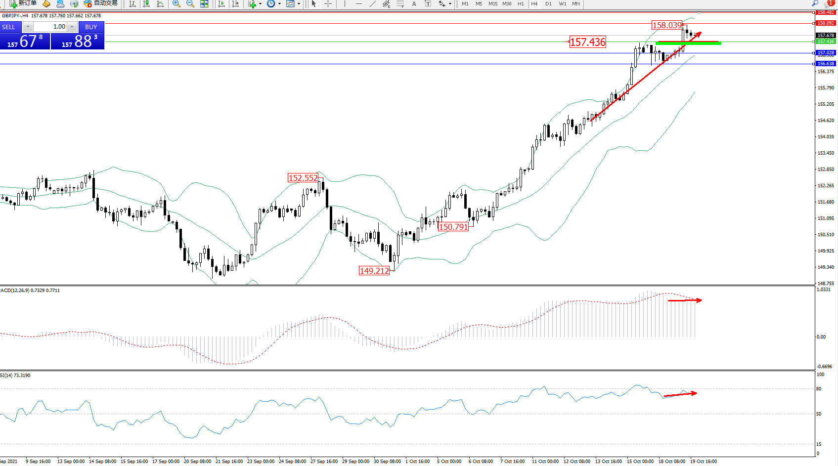 技术点评:多头动力延续布林带指标通道中上轨区间持续震荡上扬,高位抵达158.039附近整理,多头动力有进一步向上拉升态势,布林带指标收口走势持续向上拉升中,短期未见止步迹象,MACD指标处于多头区域高位整理平移,RSI指标处于高位超买区80均衡线下方弱势徘徊中;