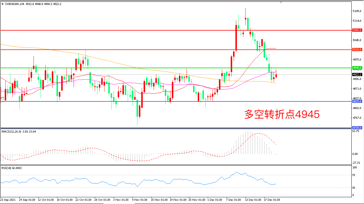 4小时图看,沪深300小幅反弹,短期走势回暖,但空头趋势未改,4945成为多空分水岭,200周期均线成为短期支撑, MACD红柱缩短,RSI指标走平,日内震荡下行概率较大。