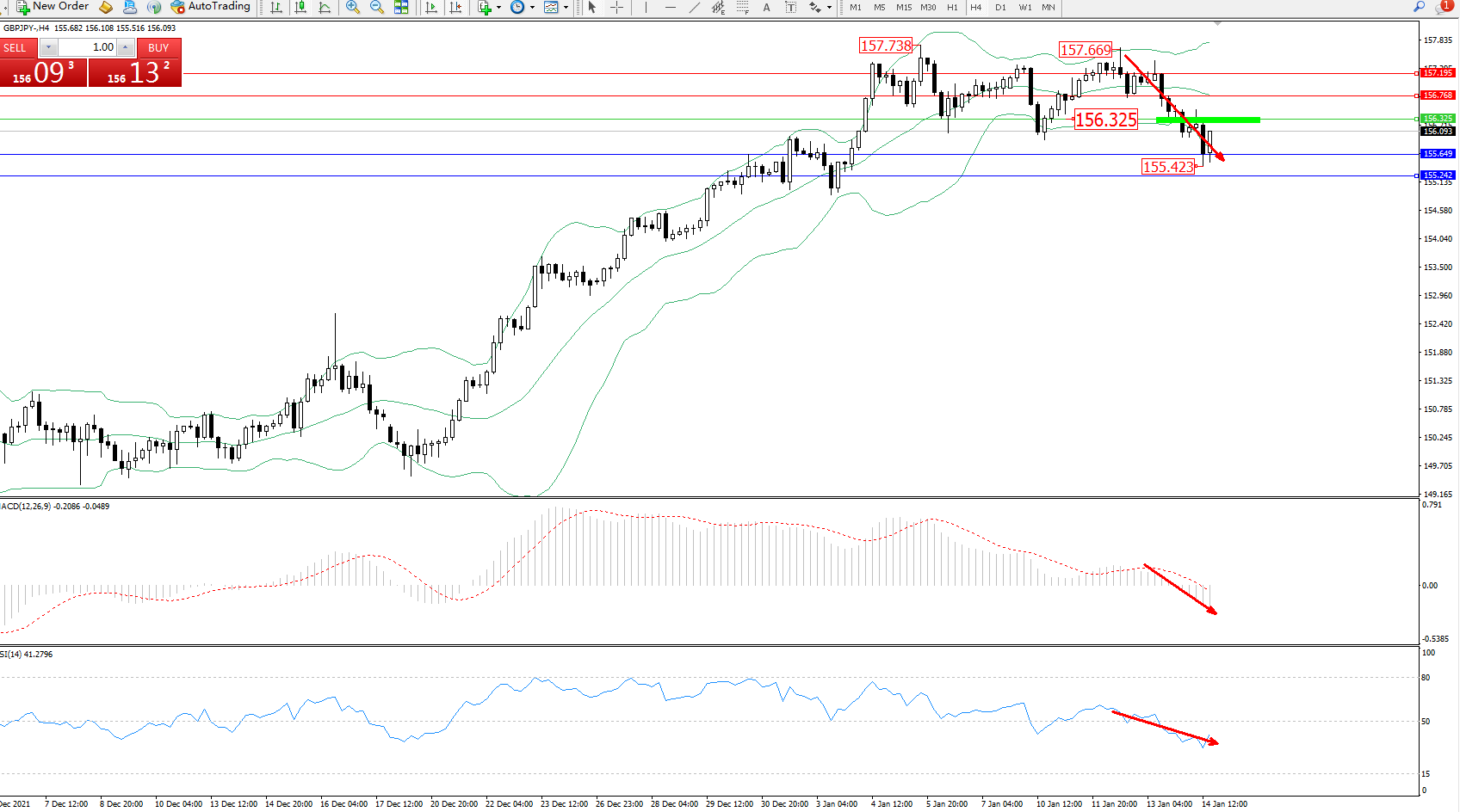 技术点评:高位空头动力延续布林带指标下轨附近持续下探,低位抵达155.423位置得到支撑,多头动力伺机入场,短暂上移,但整体下行趋势态势良好,布林带指标呈准张口走势中,高位跌势或将延续,MACD指标空头动力维持震荡下行至0轴线下方空头区域维持震荡下行,RSI指标处于空头区域持续向下移动中;