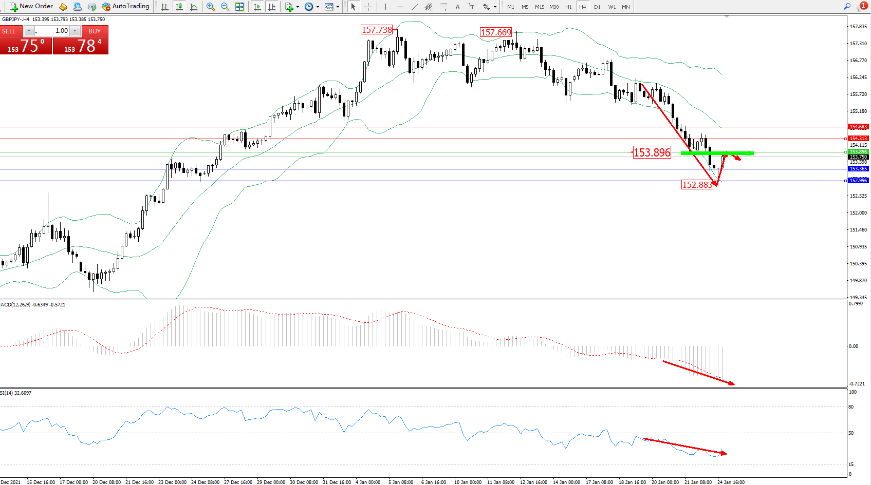 交易策略:153.896下方看跌,目标153.365、152.996