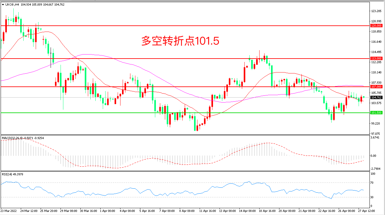 周三(4月27日),西方与俄罗斯的对峙在能源“战场”扩大化,最新消息称德国准备支持欧盟制裁俄罗斯石油,布伦特原油延续窄幅震荡,收报104.76美元/桶。油价日线十字星收盘这意味着多空相持阶段进一步延续,高位区间内的当下油价缺乏能推动单边运行的能量,油价继续横盘概率较大。