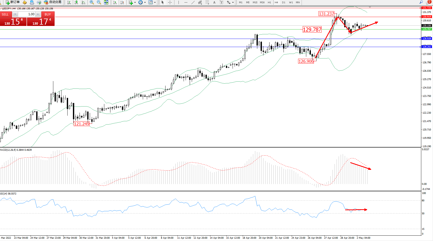 交易策略:129.787上方看涨,目标130.919、131.725
