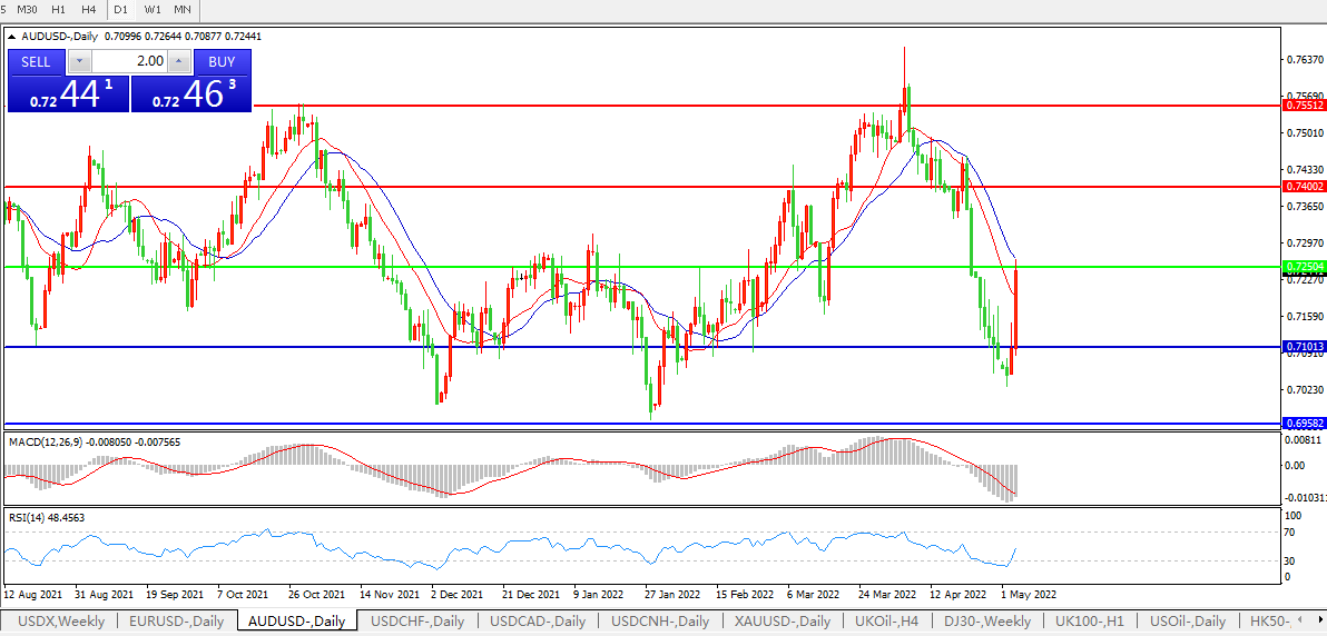 技术面简析:日图均线呈空头排列,汇价快速拉升,MACD运行于0轴下但量能持续缩量,RSI迅速走强,预计汇价大概率将进一步上行。