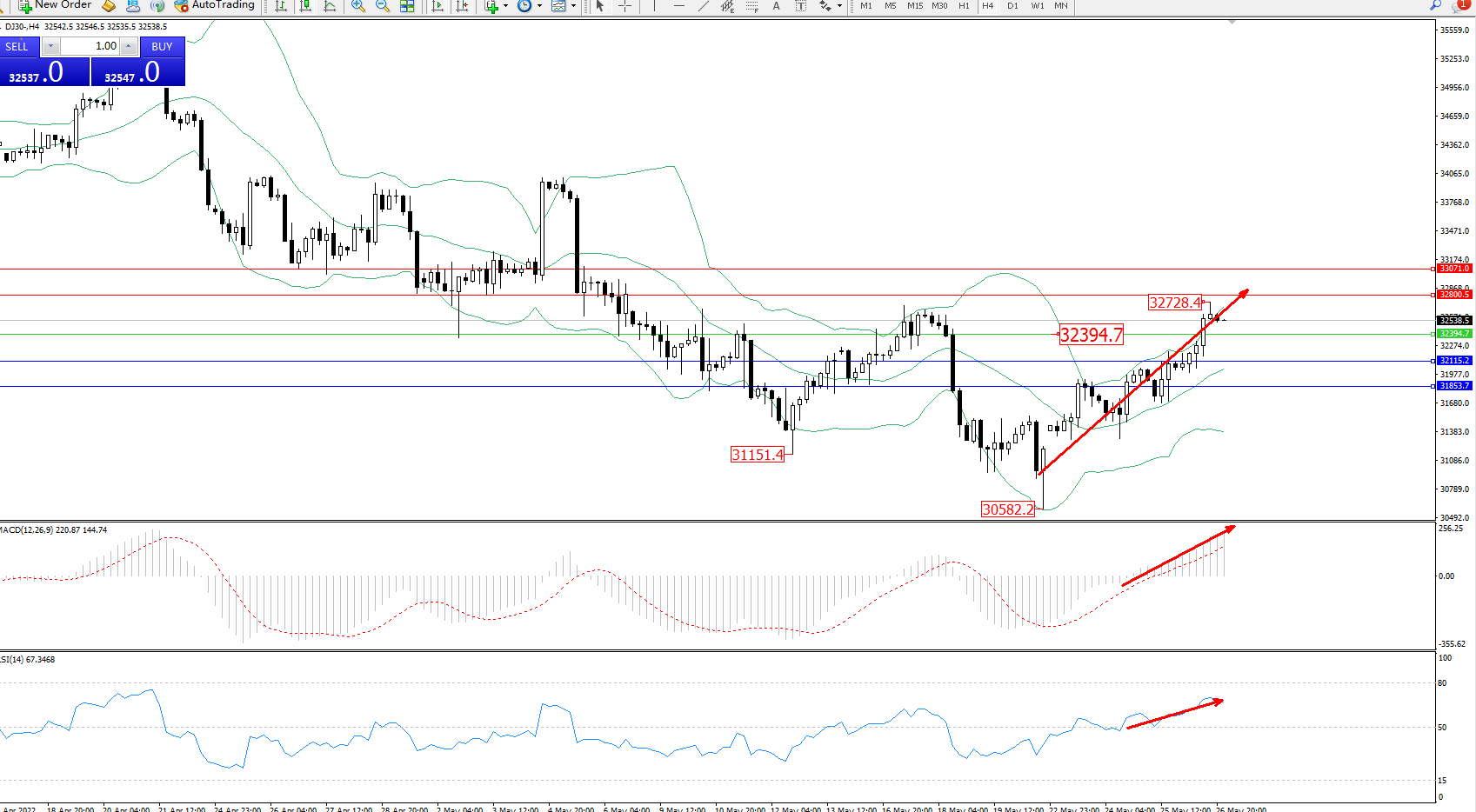 技术点评:多头动力延续布林带指标通道中上轨区间持续震荡上扬,高位抵达32728附近震荡,短期多头动力有继续上扬态势,布林带指标多头动力维持震荡拉升走势持续中,MACD指标处于多头区域维持震荡不断上移中,RSI指标处于50均衡线上側多头区域维持震荡拉升;