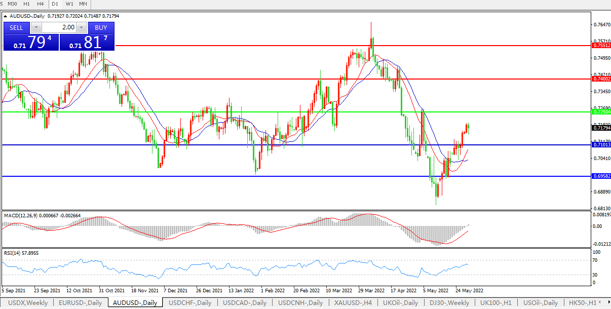 备选策略:0.7250上方看涨,目标0.7400、0.7550