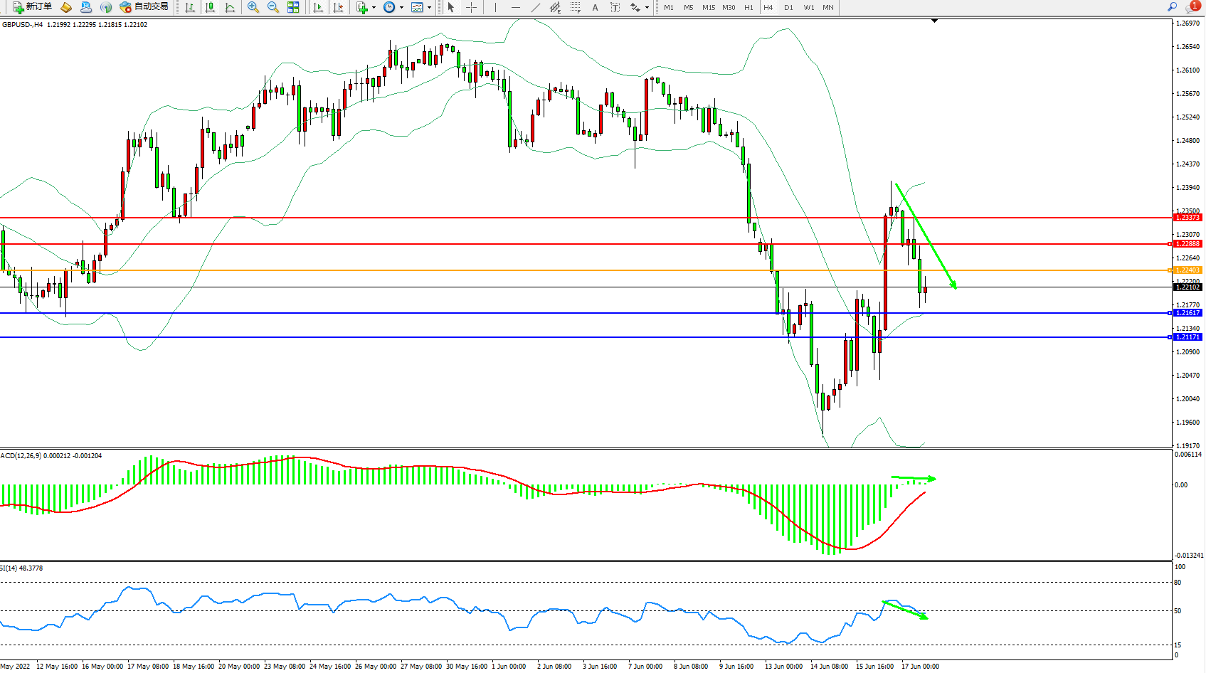 交易策略:1.22403下方看跌,目标1.21617、1.21171
