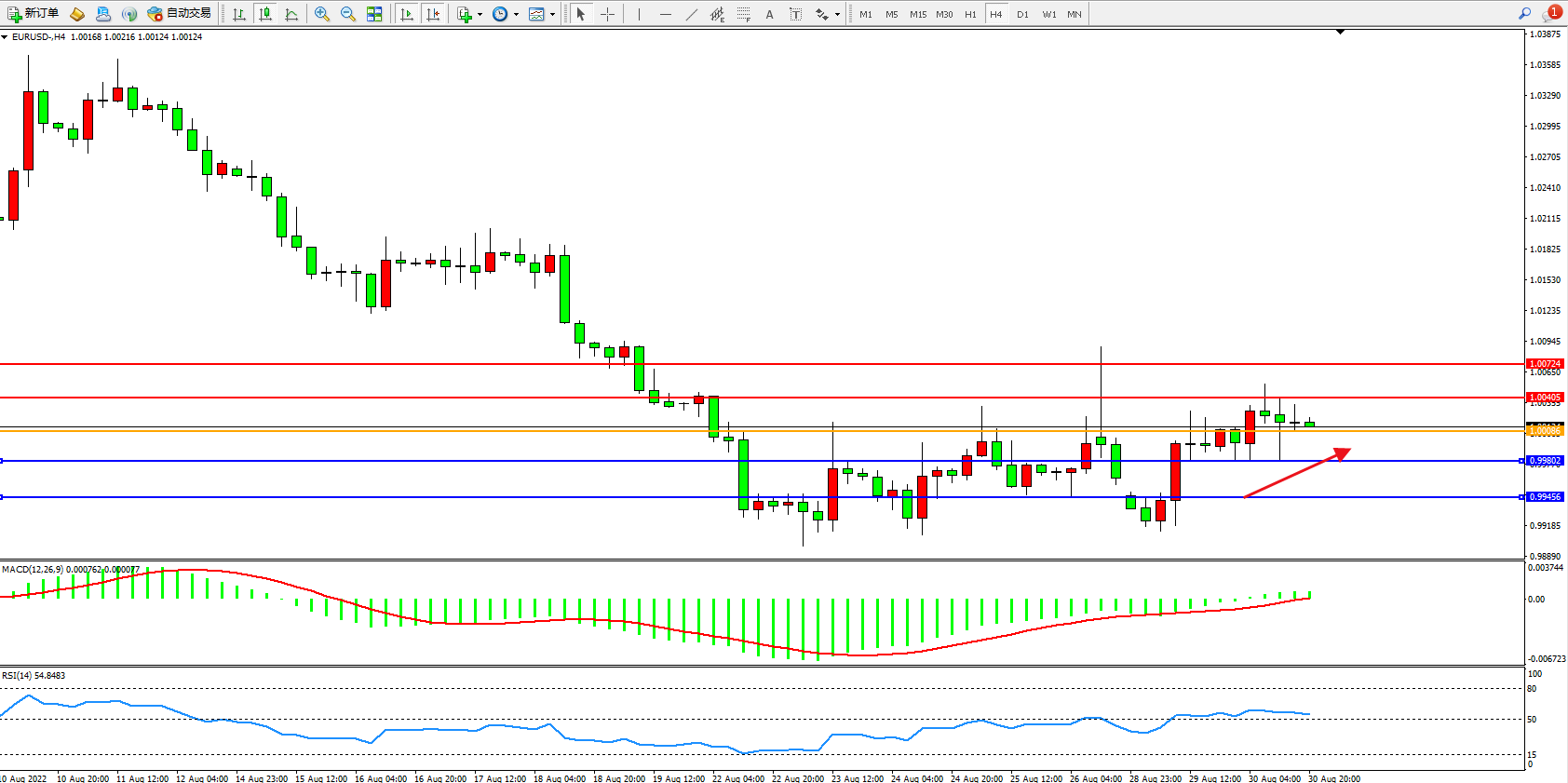 4小时图看:低位短期窄幅震荡后,多头动力伺机入场,缓慢震荡向上移动,MACD指标处于0轴线上側弱势徘徊,RSI指标处于50均衡线上側窄幅整理;