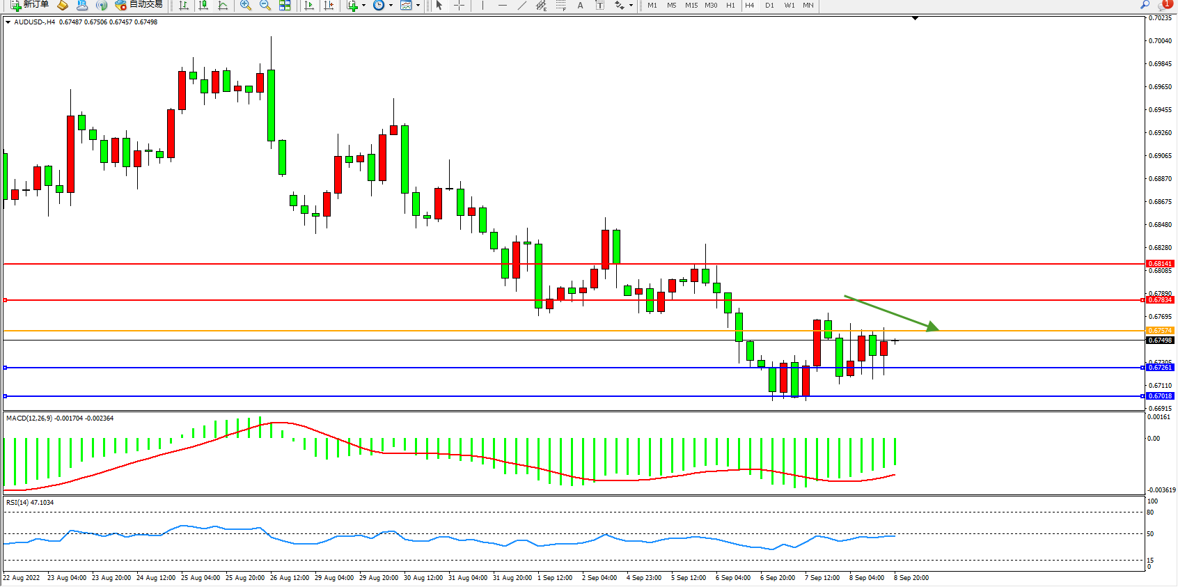交易策略:0.67574下方看跌,目标0.67261、0.67018