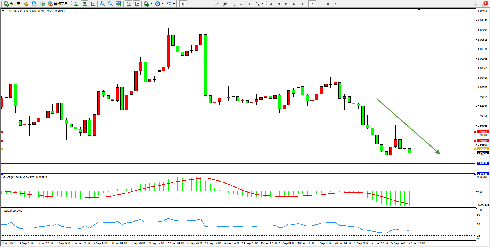 交易策略:0.98369下方看跌,目标0.97938、0.97639