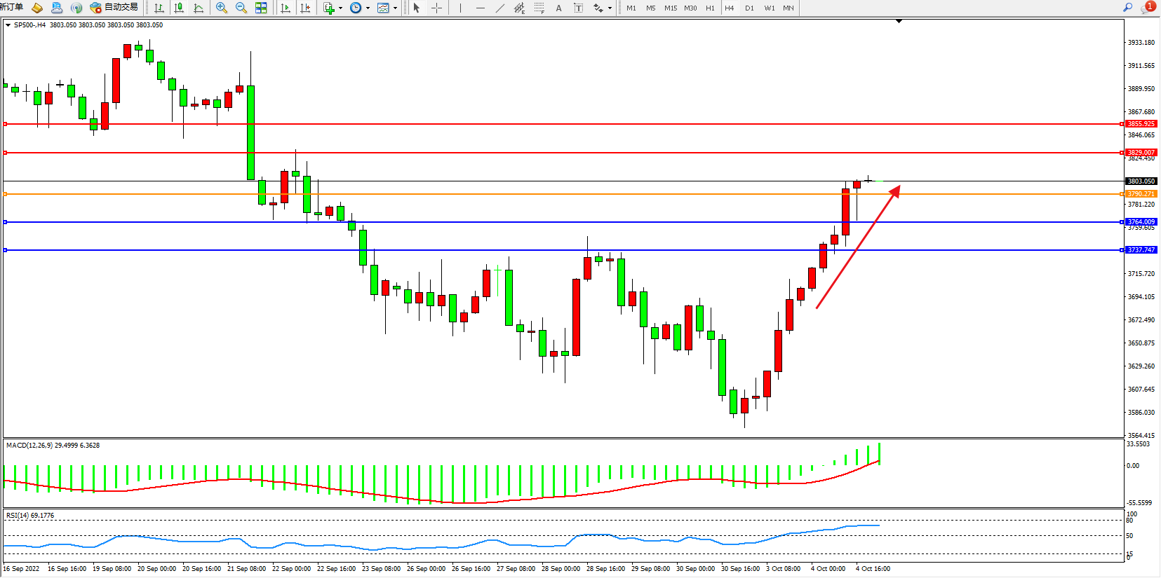 标普SP500——4小时K线图显示: