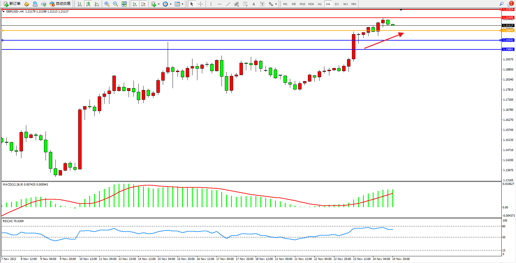 4小时图看:多头动力持续拉升后,高位窄幅整理,市场整体处于多头持续攀升中,MACD指标处于多头区域持续上扬,RSI指标处于多头区域窄幅整理后回撤;