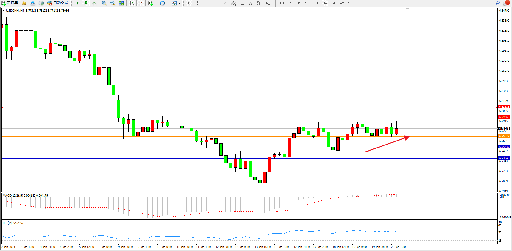 交易策略:6.78927上方看涨,目标6.79663、6.81128
