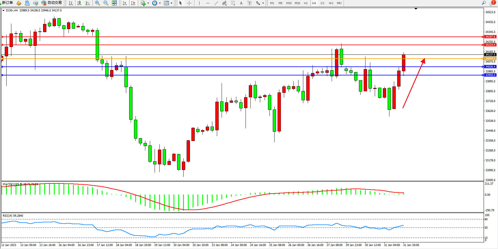 道琼斯指数1月31日(周二)收盘上涨369.80点,涨幅1.10%,报34086.89点;美国第四季度劳工成本指数季率 1%,预期1.10%,前值1.20%。已连续三个季度走低,美国工资-物价螺旋上涨的压力得到进一步缓解,创2021年第四季度以来新低。