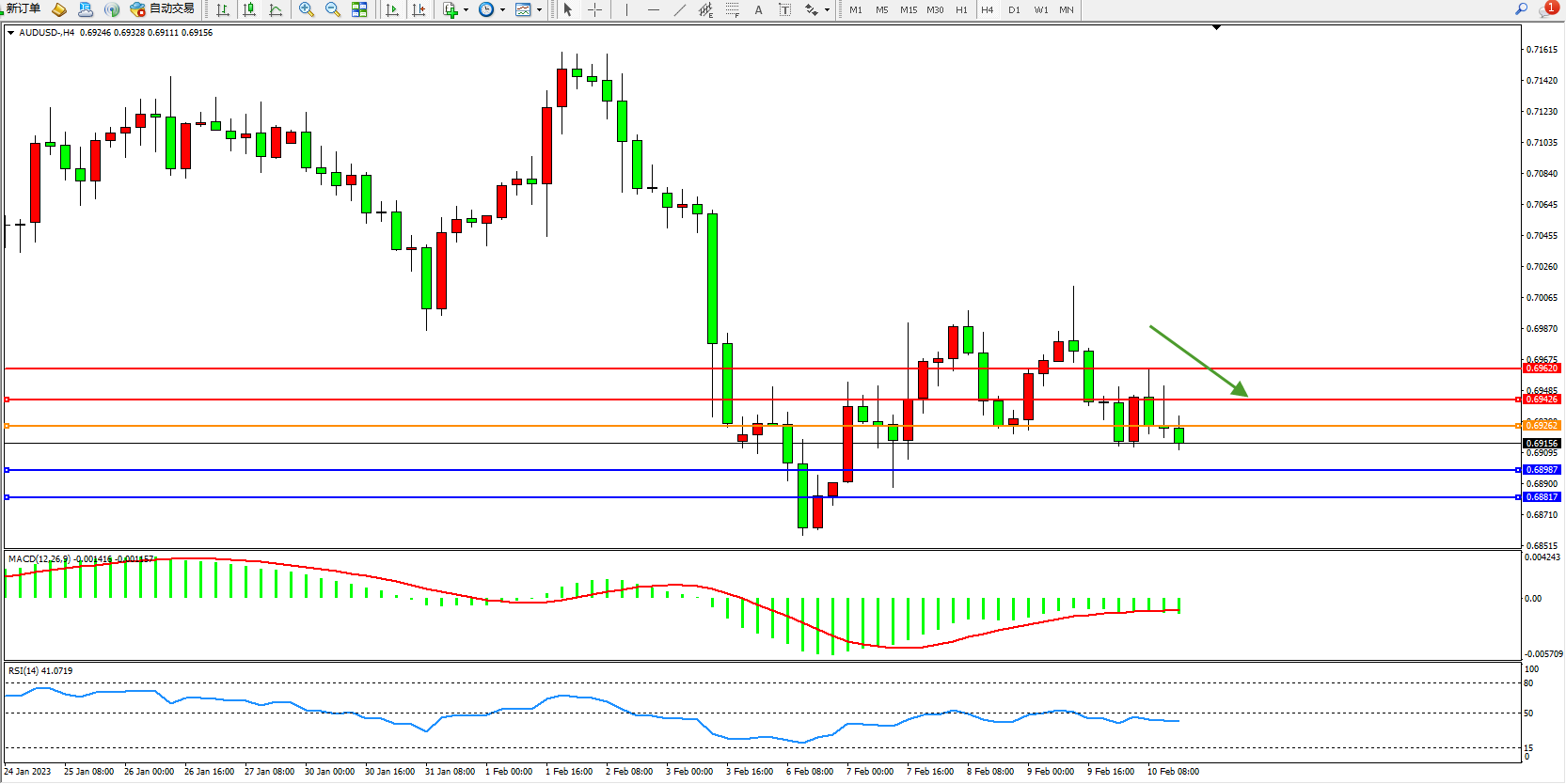交易策略:0.69262下方看跌,目标0.68987、0.68817