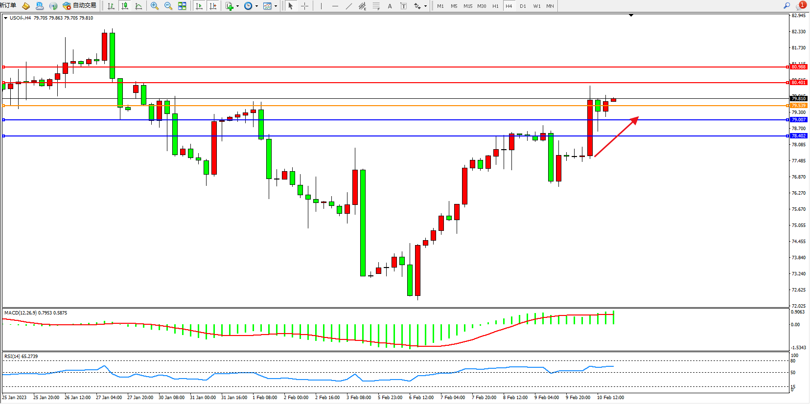 原油维持79.810附近震荡,中国1月份的消费者价格指数(CPI)与去年同期相比有所上升,通胀率接近政府去年设定的约3%的调控目标,这为石油市场增添了一种谨慎的气氛。