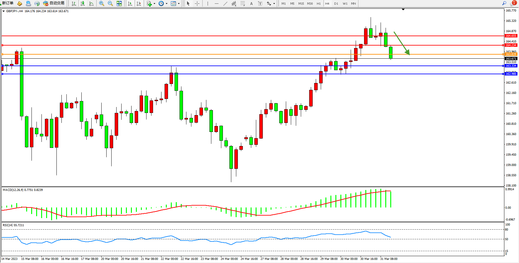 交易策略:163.839下方看跌,目标163.334  162.980